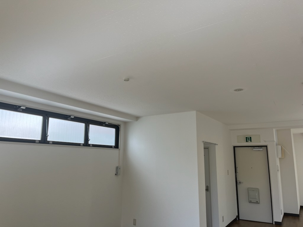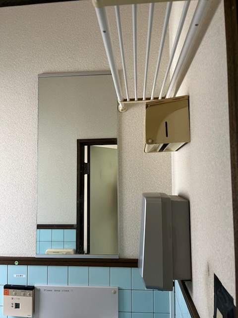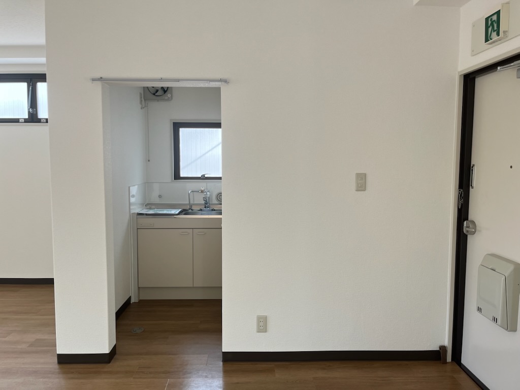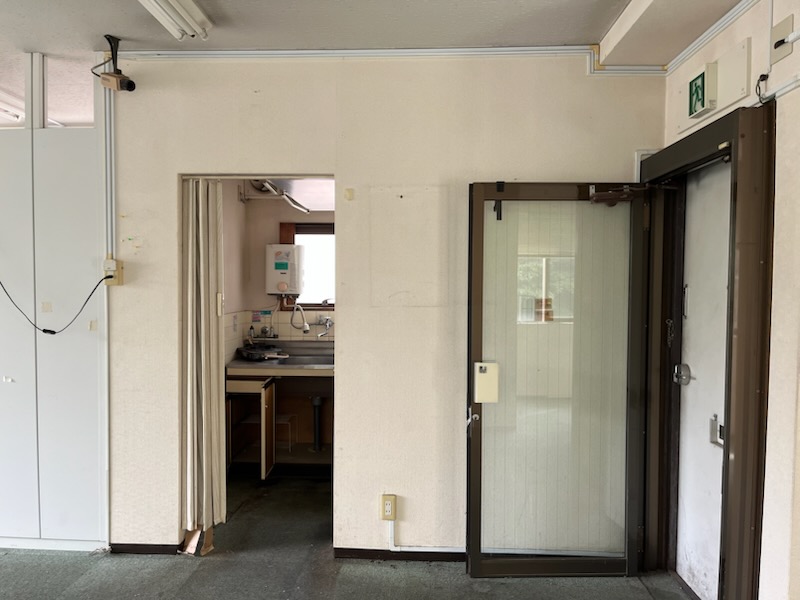 給湯室入口のアコーディオンカーテンも撤去し新しいカーテンレールを設置しています。