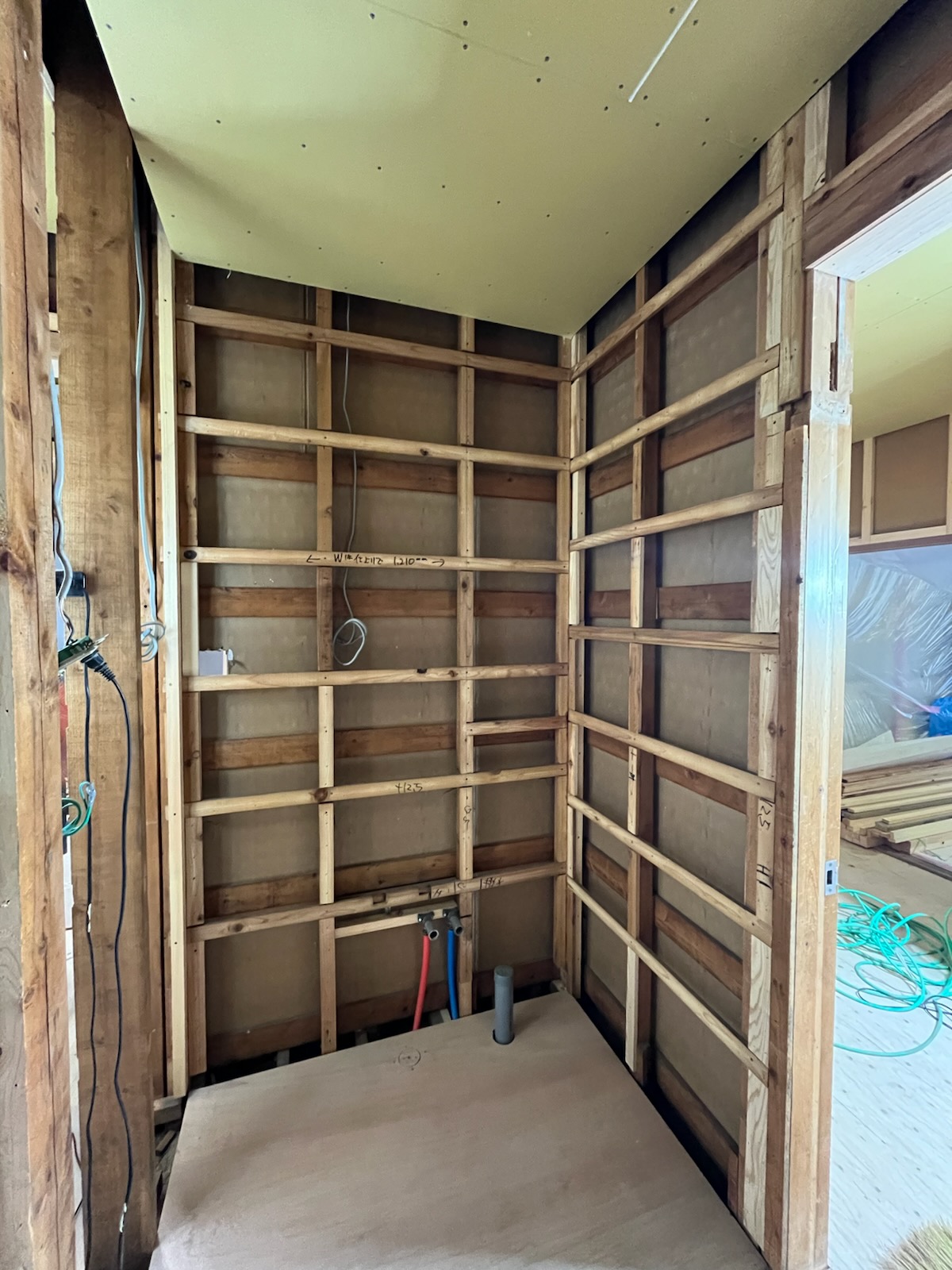 | 廊下にも手すりを付けられるよう下地施工中の大工さんの様子 | 浴室だけでなく脱衣場へ入る戸も引き戸にし段差解消 |