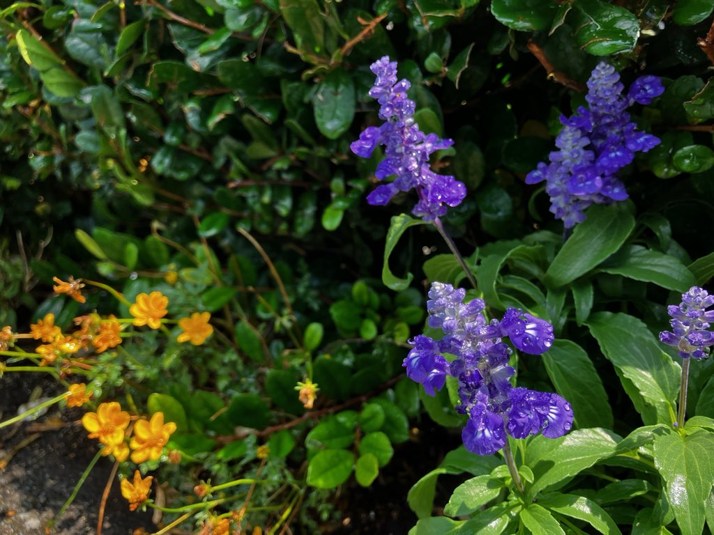 以下の写真ですとクリスマスツリーにもなる「ゴールドクレスト」は枯れてしまったので植え替えましたが、その横に咲いている「ブルーサルビア」は多年草のため残しています。
