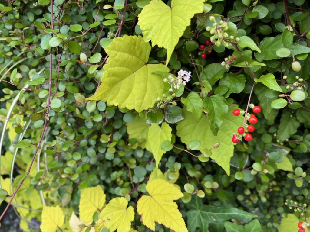オーレア/ジュズサンゴ 大きな葉がオーレア(野ぶどう)、赤い実がジュズサンゴ |