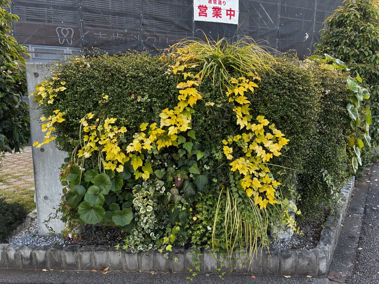 壁面緑化にはさまざまな植物を植えており、バランスを見ながら定期的に植え替えたり剪定しています。