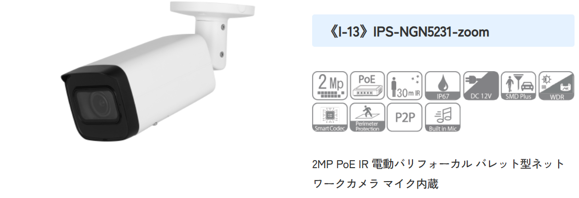 今回はIPS社の電動バリフォーカル バレット型ネットワークカメラを採用しています。