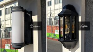 マンション共用灯のLED化改修工事例です。LED照明機器でもこのようなオシャレなランプ風のものもございます。